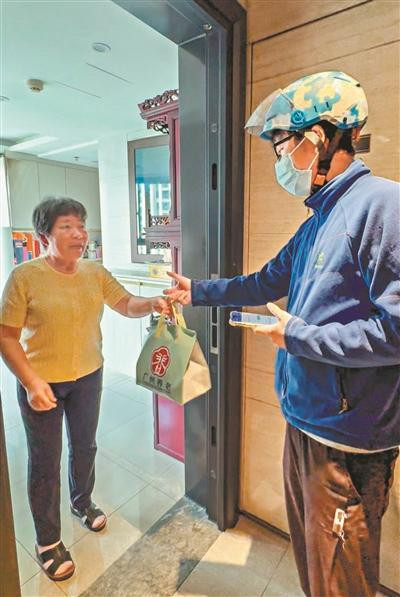 外卖小哥将杨姨在长者饭堂订购的饭菜送上门。